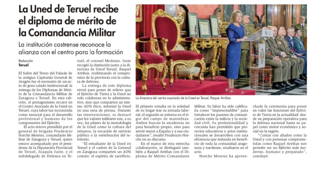 La UNED de Teruel es el motor de cohesión social de la provincia, permitiendo que el conocimiento llegue a cada rincón de la geografía turolense. Por su parte, la Academía General Militar es la cuna de la oficialidad del Ejército de Tierra, donde se forjan quienes garantizarán la seguridad de esa misma sociedad.